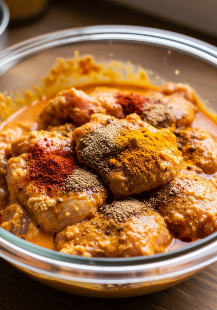In a bowl, mix yogurt, ginger-garlic paste, spices, salt, and lemon juice. Add chicken pieces and coat well.