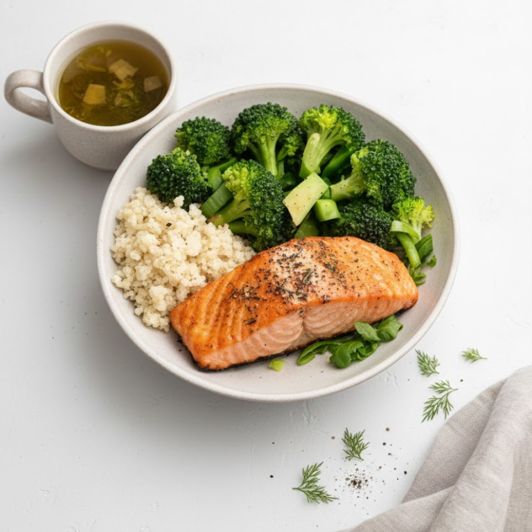 This Baked Salmon with Broccoli & Cauliflower Rice is a simple, nourishing dinner that’s high in protein, low in carbs,