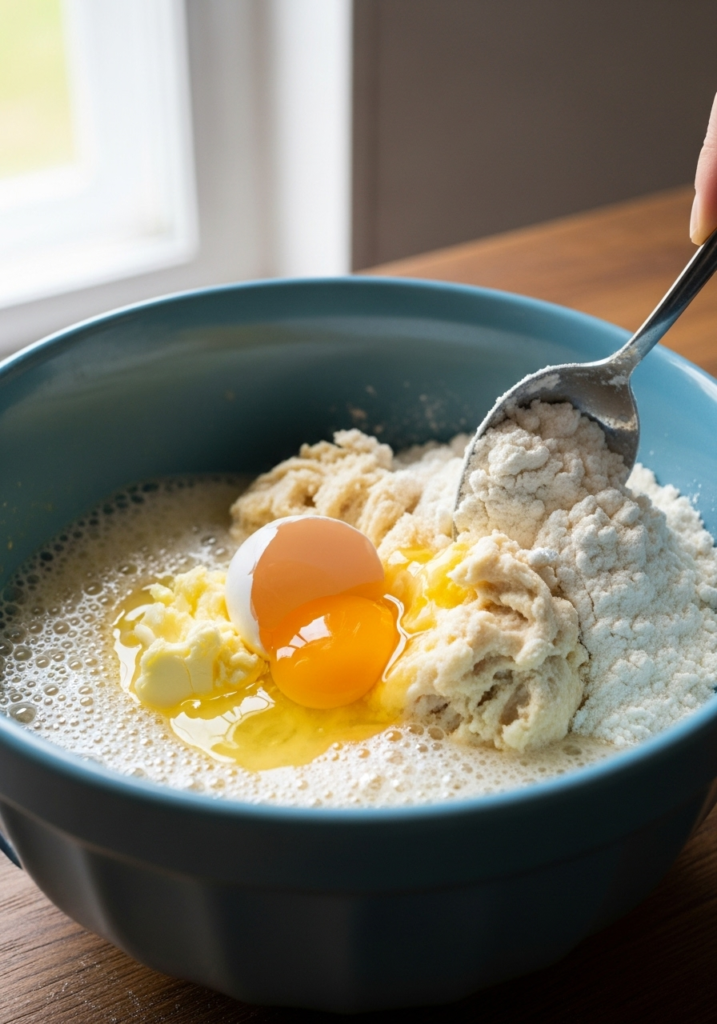 Add the egg and soft butter to the yeast mixture. Mix well until combined.