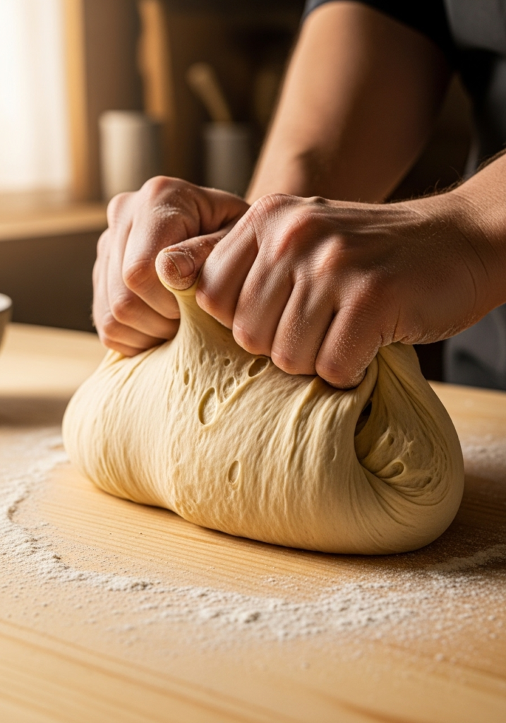 Knead for 8–10 minutes until the dough is smooth, elastic, and slightly sticky.