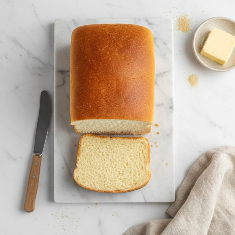 This is the kind of bread that disappears slice by slice while it’s still warm. Soft enough to press with one finger and watch it bounce back — true comfort baking.